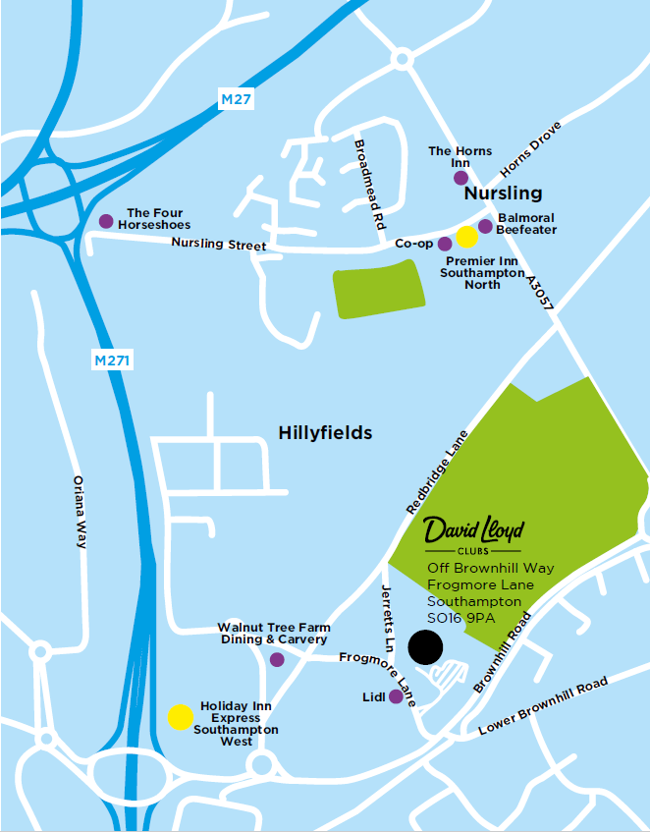 - Car- The venue is located just off the M271, accessed via the M27.